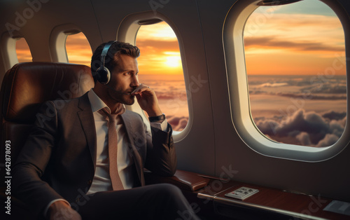 © Kedek Creative, Fototapeta premium handsome businessman looking at airplane window while using headphone in private jet