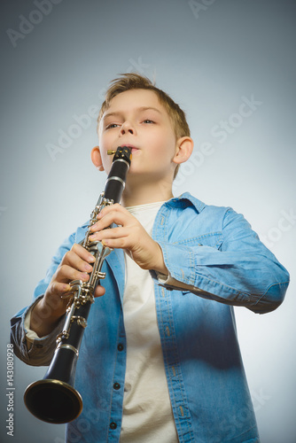 © dreamsnavigator, Fototapeta premium Handsome Caucasian boy play a Bassoon on grey background