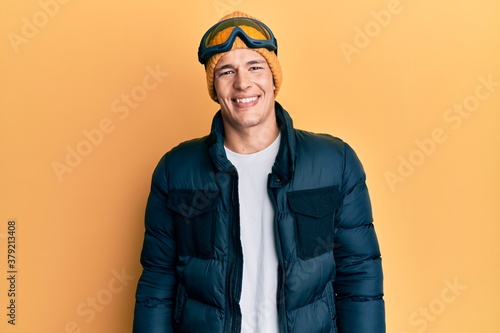 © Krakenimages.com, Fototapeta premium Handsome caucasian man wearing snow wear and sky glasses with a happy and cool smile on face. lucky person.