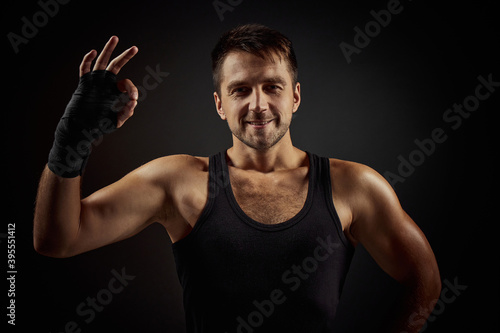 Fototapeta premium Handsome fit smiling bearded man showing Ok gesture on black background
