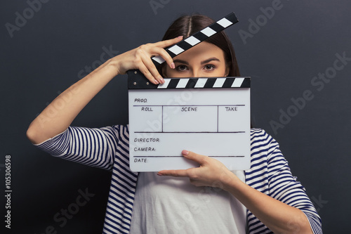 © VadimGuzhva, Fototapeta premium Handsome girl with clapperboard