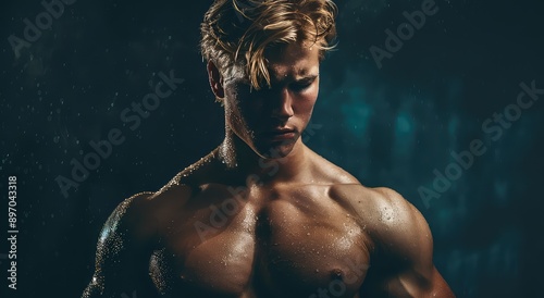 © Yury, Obraz premium Handsome guy fitness model posing holding dumbbells in his hands.