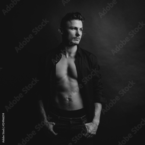 © Serhio Lee, Naklejka premium Handsome guy in naked body with shirt