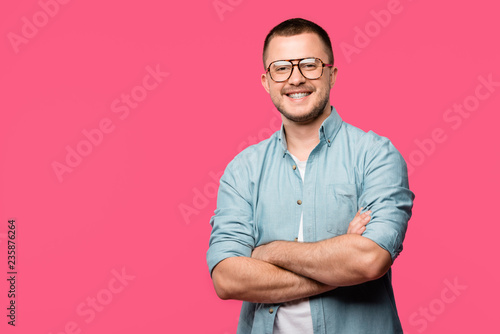 © LIGHTFIELD STUDIOS, Fototapeta premium handsome happy man standing with crossed arms and smiling at camera isolated on pink