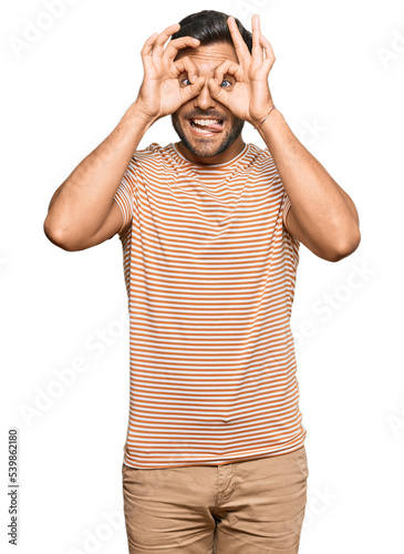 Naklejka premium Handsome hispanic man wearing casual clothes doing ok gesture like binoculars...