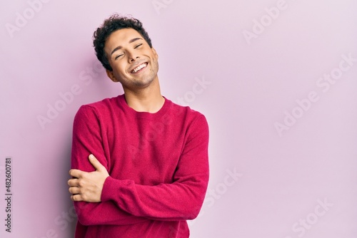 © Krakenimages.com, Obraz premium Handsome hispanic man wearing casual clothes over pink background happy face smiling with crossed arms looking at the camera. positive person.