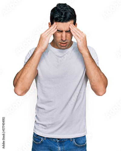 Naklejka premium Handsome hispanic man wearing casual white t shirt with hand on head for pain in head because stress. suffering migraine.