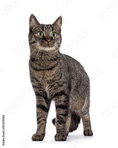 © Nynke, Obraz premium Handsome house cat with tabby pattern, standing facing front. Looking side ways beside camera. Isolated on a white background.