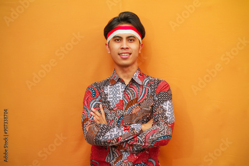 © Muhammad Alimaki, Fototapeta premium Handsome Indonesian man in Batik shirt celebrating Indonesian Independence Day on August 17 concept, posing with confident dashing and looking at the camera