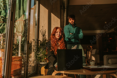 © qunica.com, Naklejka premium Handsome male person standing behind his female ginger colleague and watching her working on the lap top. He is giving suggestions