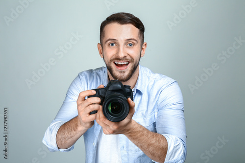 © Pixel-Shot, Fototapeta premium Handsome male photographer on light background