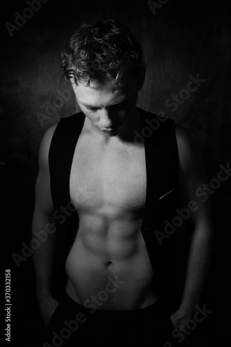 Fototapeta premium Handsome male with open waistcoat revealing defined pecs and muscular sixpack abs looking down