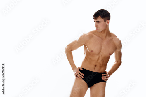 Fototapeta premium handsome man athlete with a pumped-up body in dark shorts on a light background