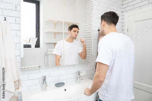 Fototapeta premium Handsome man brushing teeth and looking at the mirror in the bathroom
