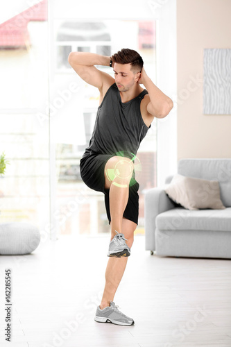 Fototapeta premium Handsome man doing bicycle crunch at home