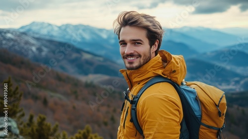 © CStock, Naklejka premium Handsome man enjoying a scenic mountain hike, taking in the view with a contented smile