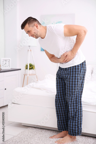 Obraz premium Handsome man feeling stomachache pain at home