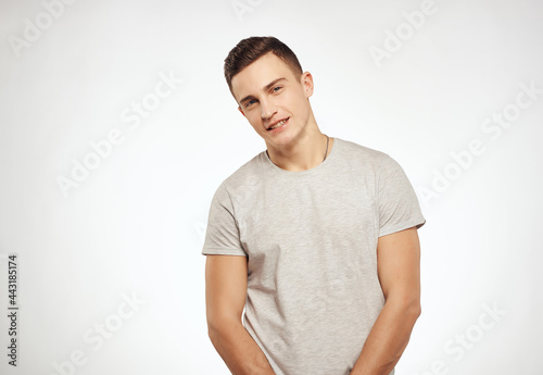 Obraz premium handsome man in light t-shirt cropped view studio lifestyle