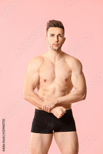 © Pixel-Shot, Fototapeta premium Handsome man in underwear on color background