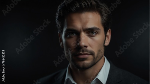 © Arceli, Fototapeta premium handsome man looking at camera serious on dark plain black background from Generative AI