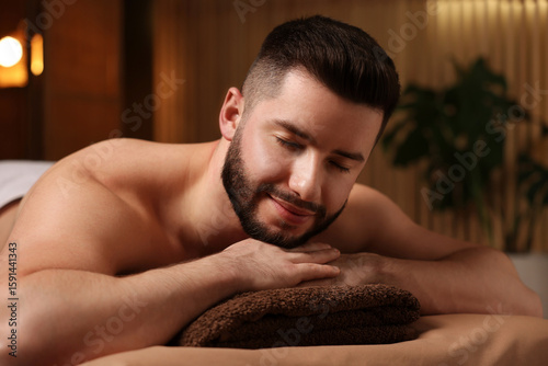 Fototapeta premium Handsome man lying on massage table in spa salon