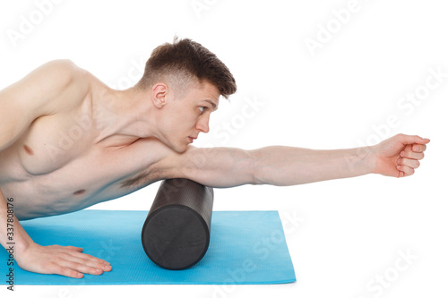 © BY-_-BY, Obraz premium Handsome man shows exercises using a foam roller