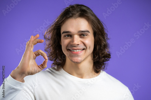 Fototapeta premium Handsome man shows okay, ok gesture. Happy guy on violet background. Winner....