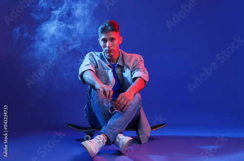 Fototapeta premium Handsome man sitting on skateboard in smoke and color lights against blue...