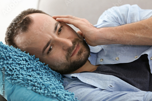 Fototapeta premium Handsome man suffering from headache while lying on sofa at home