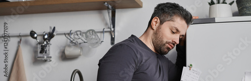 Fototapeta premium Handsome man thoughtfully organizing notes in a modern kitchen while enjoying...