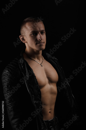 © Andrei Sasin, Fototapeta premium Handsome man wearing leather jacket on a naked muscular torso, on a dark background, looking into the camera.