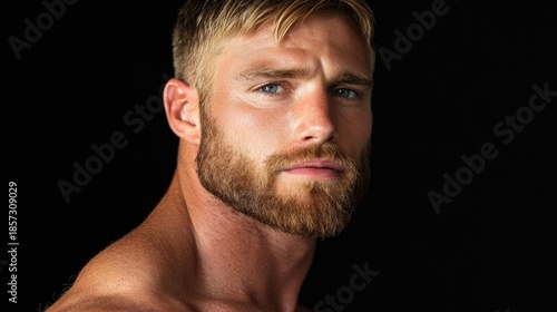 © Pricha.RT, Fototapeta premium Handsome Man with Beard and Piercing Blue Eyes on Black Background
