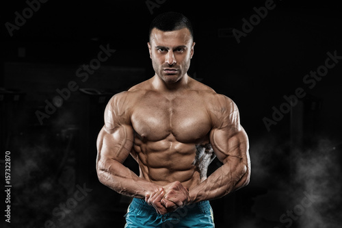Fototapeta premium Handsome man with big muscles, posing at the camera in the gym