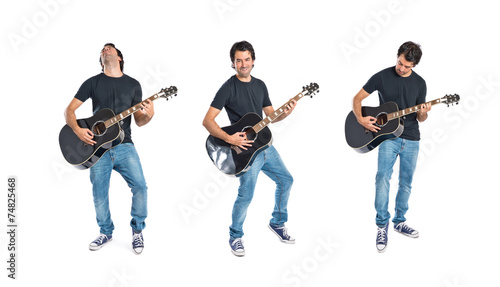 © luismolinero, Fototapeta premium Handsome man with guitar over white background