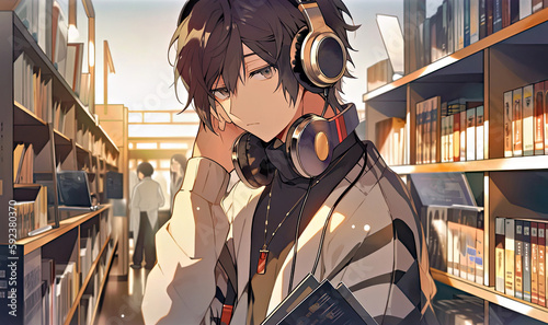 © HiroSund, Fototapeta premium Handsome man with headphones standing in the library, Generative AI