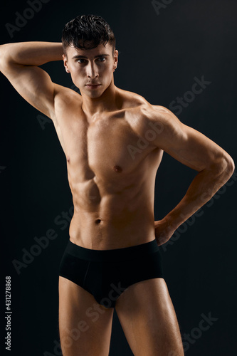 Fototapeta premium handsome man with muscled naked body in dark panties cropped view studio