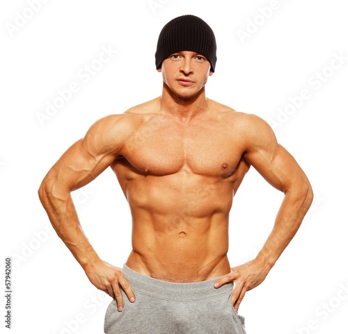 © Nejron Photo, Fototapeta premium Handsome man with muscular torso in beanie hat posing