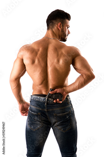 © theartofphoto, Fototapeta premium Handsome man with naked muscular torso holding hand gun