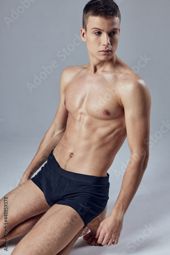 © SHOTPRIME STUDIO, Naklejka premium handsome man with pumped up abs black panties posing cropped view model