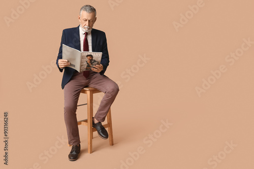 Fototapeta premium Handsome mature man in stylish formal suit with tie and magazine sitting on chair against beige background