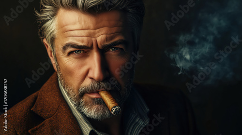 Fototapeta premium Handsome mature man smoking cigar. Portrait of elegant middle aged bearded man with cigar