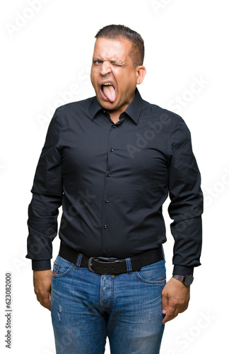 © Krakenimages.com, Fototapeta premium Handsome middle age arab business man over isolated background sticking tongue out happy with funny expression. Emotion concept.