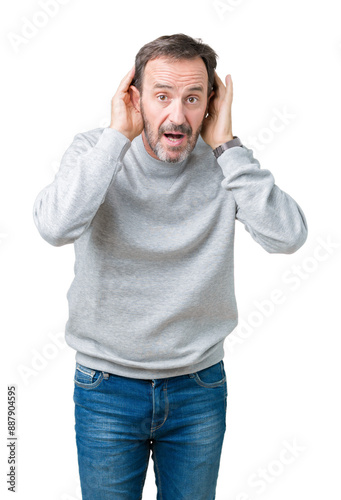 © Krakenimages.com, Naklejka premium Handsome middle age senior man wearing a sweatshirt over isolated background Trying to hear both hands on ear gesture, curious for gossip. Hearing problem, deaf