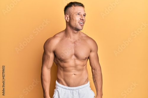 Fototapeta premium Handsome muscle man standing shirtless looking away to side with smile on...