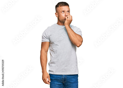 © Krakenimages.com, Fototapeta premium Handsome muscle man wearing casual grey tshirt looking stressed and nervous with hands on mouth biting nails. anxiety problem.