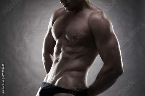 © staras, Fototapeta premium Handsome muscular bodybuilder posing on gray background. Low key close up studio shot