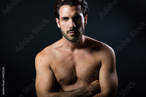 © nenetus, Fototapeta premium Handsome muscular male model posing over black background.