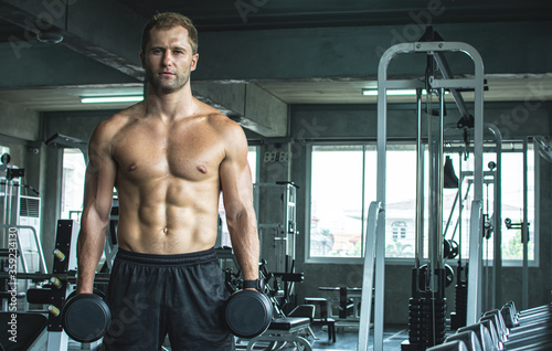 Naklejka premium Handsome muscular man is doing exercise in gym