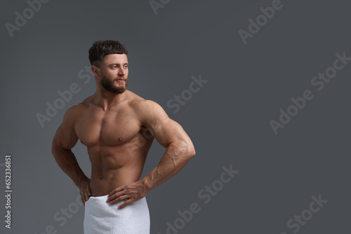 Fototapeta premium Handsome muscular man on grey background, space for text. Sexy body