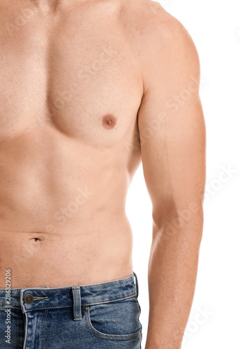 © Pixel-Shot, Fototapeta premium Handsome muscular man on white background. Weight loss concept